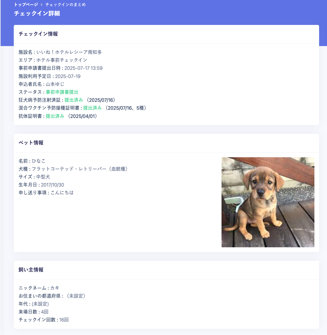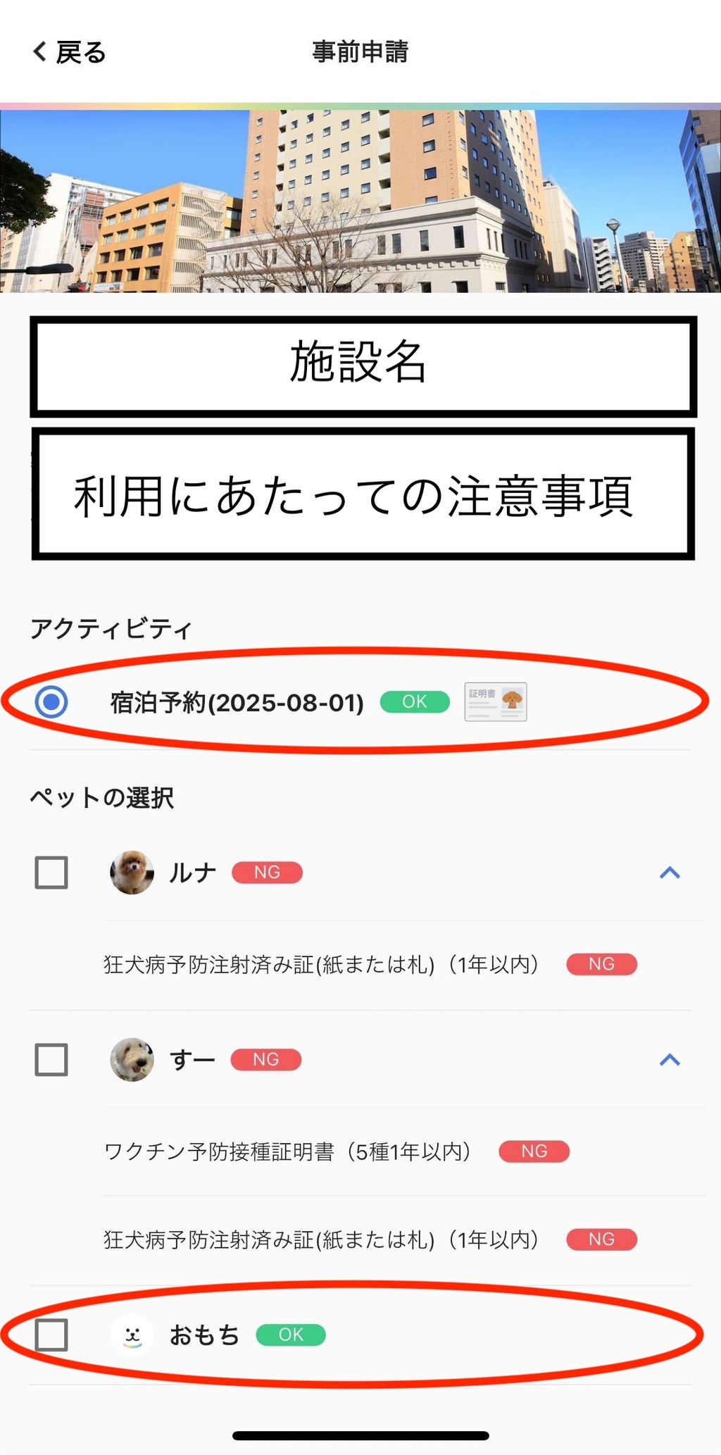 - 施設のチェックイン画面になり、アクテビティと一緒に入るワンちゃんを選択