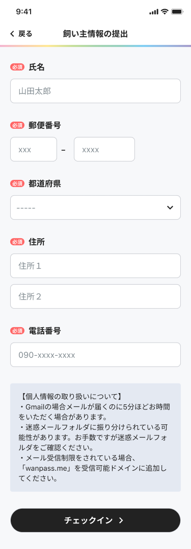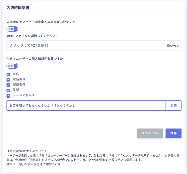 Wan!Passではチェックイン時に同意書を設定いただくことにより、ユーザーの個人情報を取得できる機能があります。取得する情報はお好きな項目を選択できます。