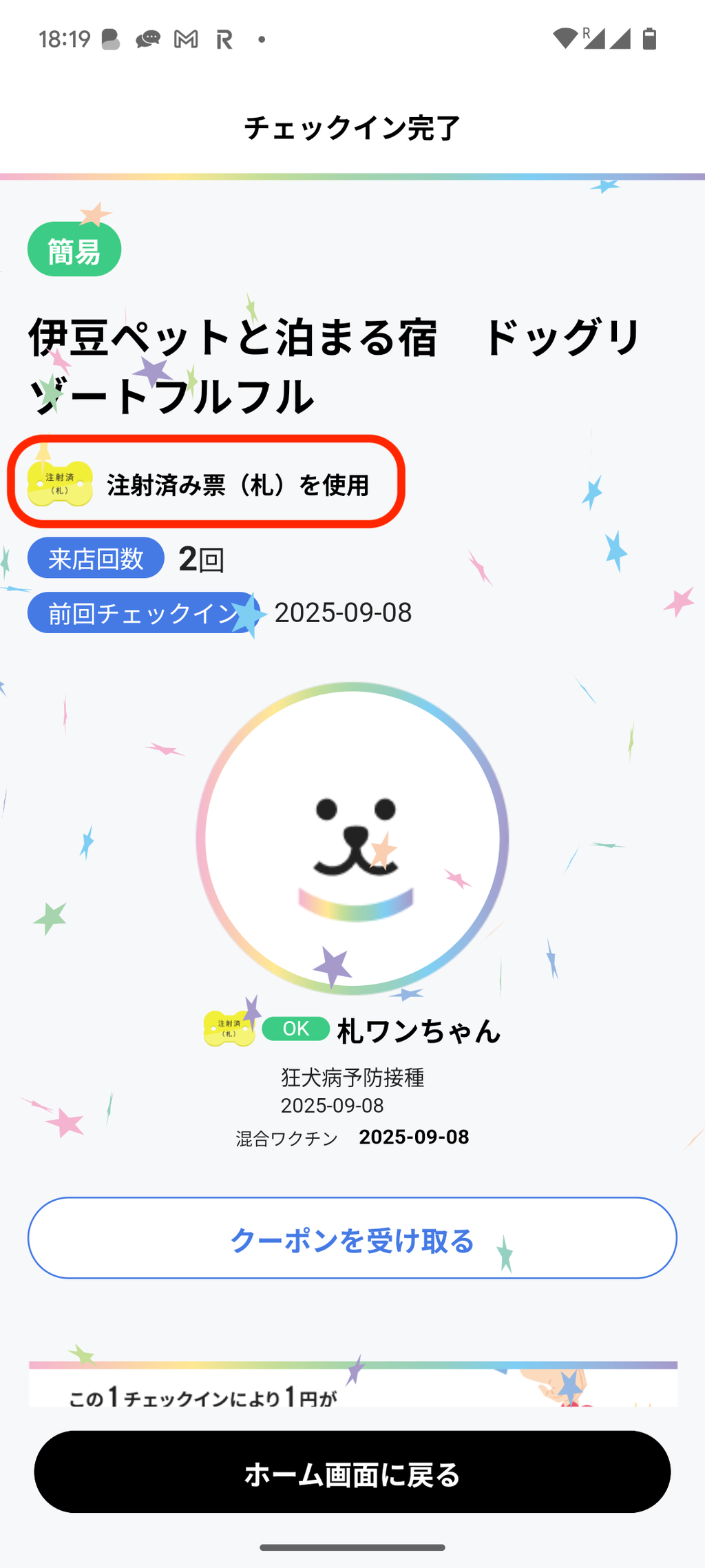 スタッフの対応は原則不要です。 ただし、「注射済票(札)を使用」とチェックイン完了画面に表示された場合は、必要に応じて現物をご確認ください。
