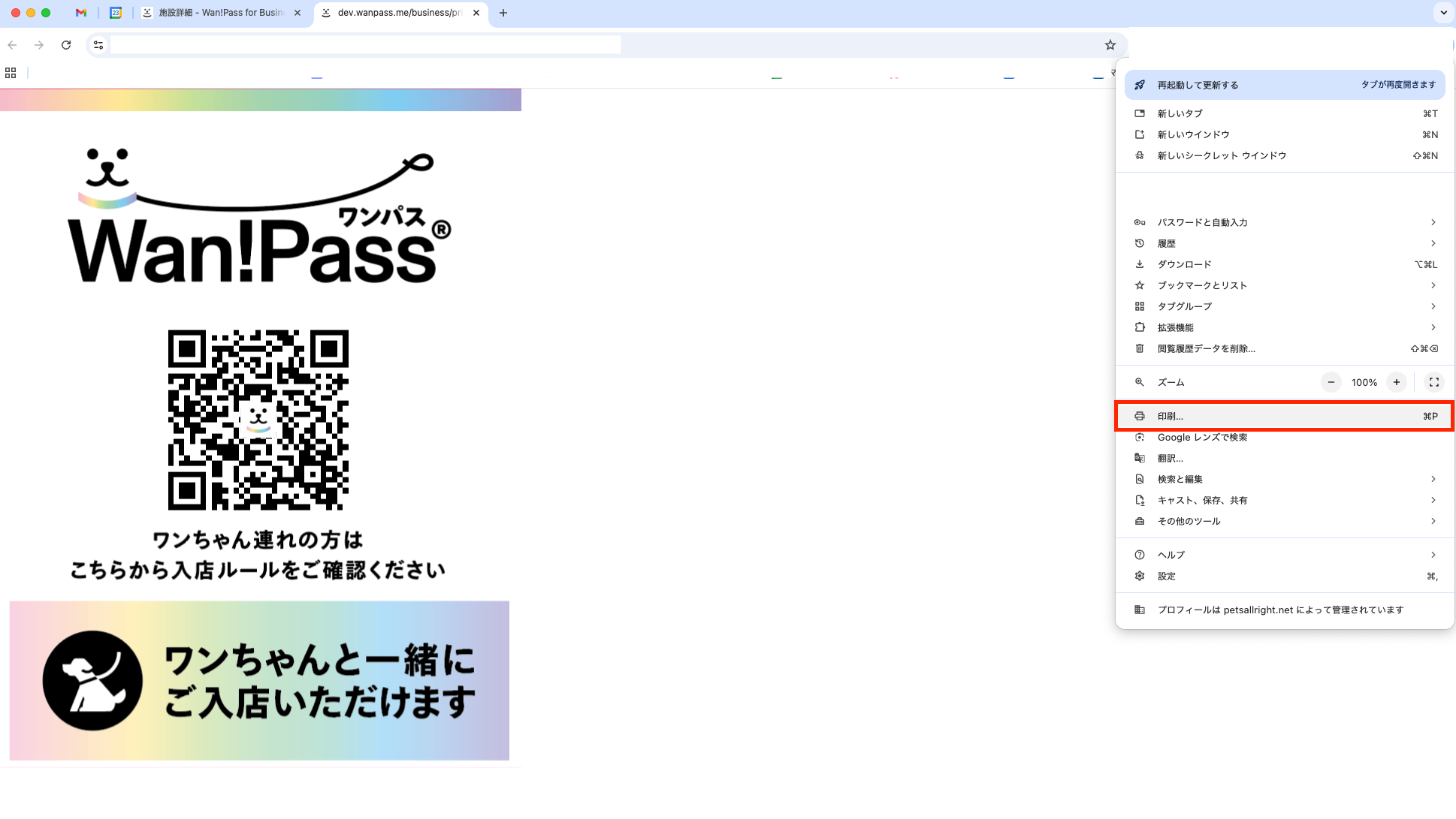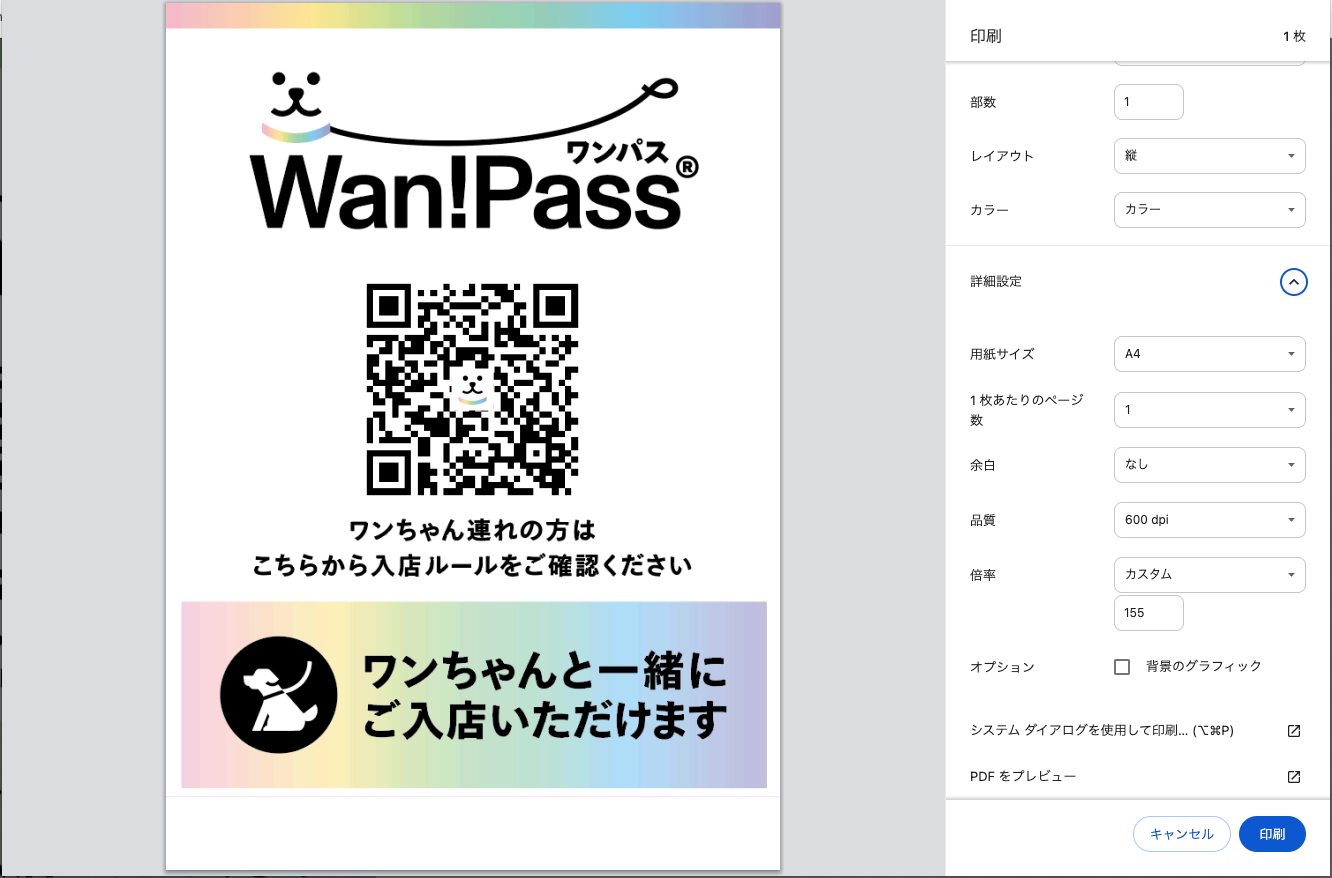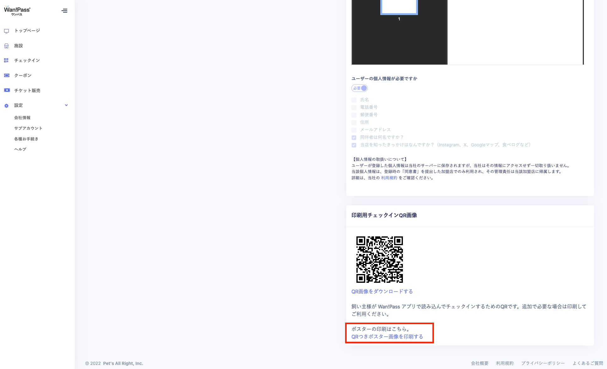 - 一番下までスクロールして、印刷用チェックインQR画像にある、QRつきポスター画像を印刷するをクリック