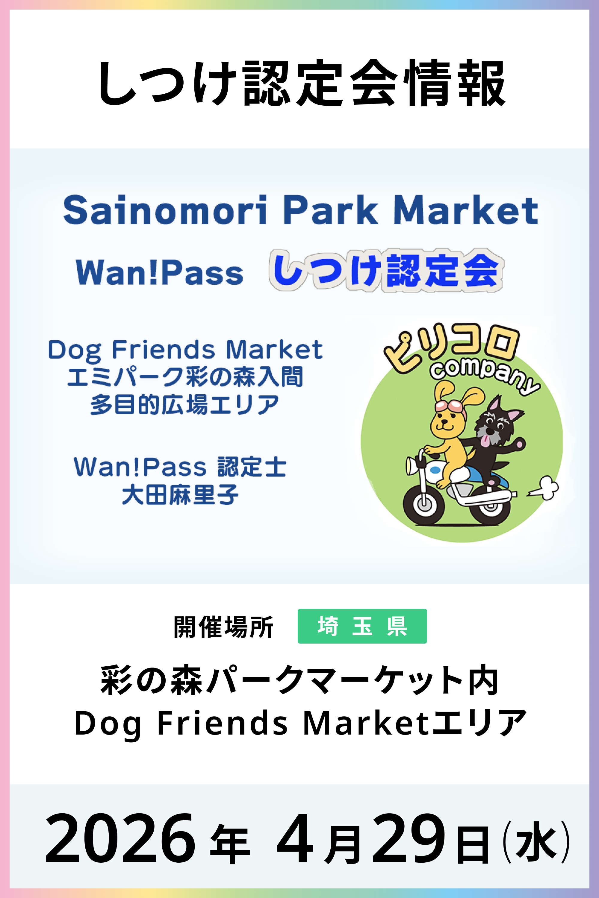 11 likes, 0 comments - dogfriendsmarket on April 5, 2026: "🐶出店者様紹介【-彩- Sainomori Park Market】Vol.62026年4月29日(水・祝) 10:00~16:00(荒天中止)場所:エミパーク彩の森入間 @sainomori_park_market 彩の森入間公園多目的広場ドッグフレンズマーケット@dogfriendsmarket +++++ 【 Wan!Pass しつけ認定会 】 Wan!Pass認定士 ピリコロ⭐︎カンパニー 大田麻里子トレーナーによる しつけ認定会です! 試験項目のポイントなども 教えてもらえますよ🙌 洋服着脱/無料 レベル1項目/1項目につき500円(税込) ・アイコンタクト:レベル1 ・おすわり:レベル1 ・マテ:レベル1 <しつけ認定会> 当日受付 10:10〜10:40 12:00〜12:20 13:00〜13:40 15:00〜15:20 <しつけ相談> 当日受付 20分/2,000円(税込) 11:00〜11:40 14:00〜14:40 ワンちゃんのお悩み事がございましたら お気軽にお立ち寄りください♪+++++ #ドッグイベント#dogfriendsmarket #犬とおでかけ #ワンパスしつけ認定会 #彩の森パークマーケット".