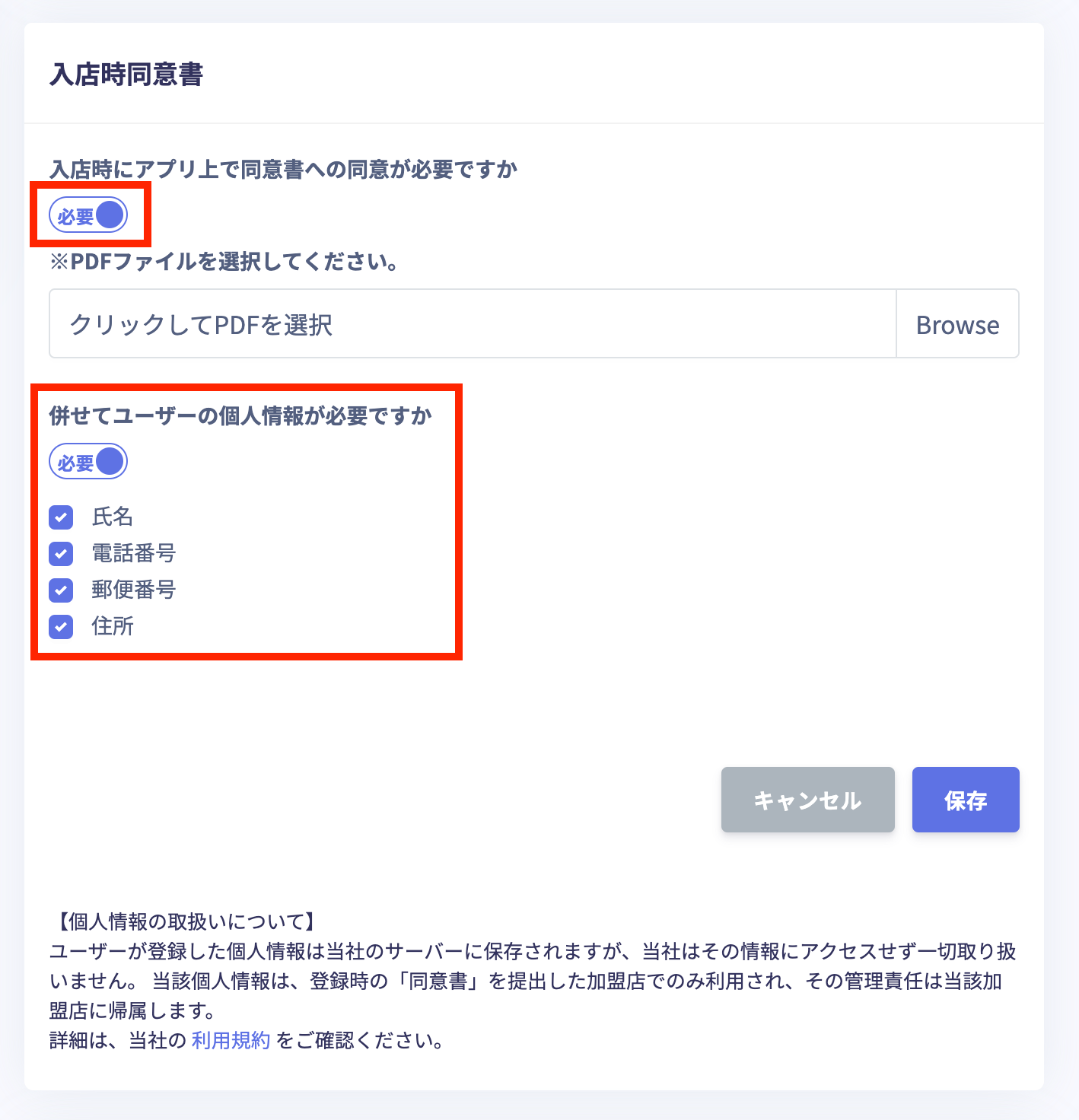 対象施設の編集ページにて「入店時同意書」という項目がありますので、こちらよりPDFを登録してください。